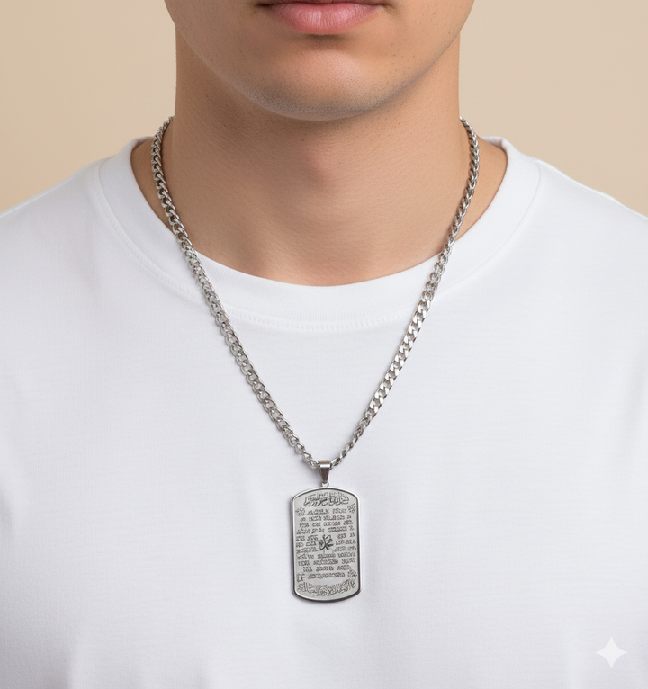 This necklace features a beautifully engraved Quranic verse in elegant Arabic calligraphy, designed for men who appreciate spiritual and meaningful jewelry. Crafted with care from high-quality materials and available in gold or silver tones, it’s a durable and stylish accessory that serves as a daily reminder of faith and guidance. Perfect for everyday wear or as a thoughtful, faith-inspired gift.