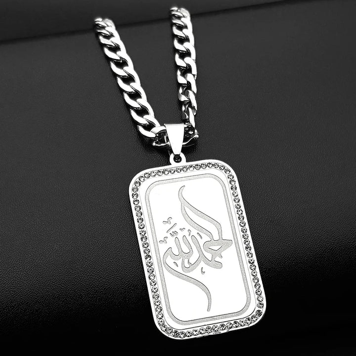 Elevate your style with this Allah Quran Crystal Medallion Necklace, crafted from high-quality stainless steel with a luxurious gold finish. Designed for both men and women, this geometric pendant features sparkling crystals and elegant Arabic inscriptions that symbolize faith, protection, and spiritual connection. A perfect accessory for everyday wear or as a meaningful Islamic gift.